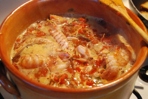 - Dopo qualche bollore mettere giù le seppie che devono cuocere un quarto d'ora abbondante, a fuoco dolce e a tegame coperto; poi, quando il sugo comincia a restringersi, le seppie si accostano in un lato della casseruola e si sistema il resto del pesce, tenendo presente che prima vanno messe le pannocchie, gli scampi e le teste grosse e via via gli altri tipi, i merluzzi, le triglie e le sogliole.