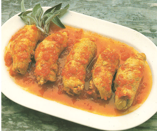 - Unire il vino e continuare a cuocere a fiamma bassa, aggiungendo, se necessario, poco brodo caldo per volta. Una volta ben cotti, porre gli involtini con il loro sugo in un piatto di servizio riscaldato e portare subito in tavola. A piacere si può versare sugli involtini qualche cucchiaio di salsa di pomodoro.