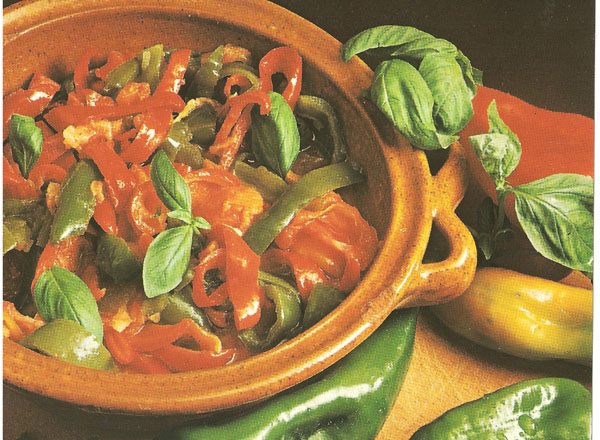 Far dorare la cipolla con l'olio in un tegame coperto; unire qualche cucchiaio d'acqua e continuare la cottura a tegame scoperto. Far abbrustolire leggermente i peperoni sulla fiamma, pelarli, aprirli, privarli dei semi, lavarli, asciugarli e tagliarli a listarelle.