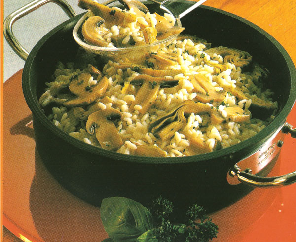 - Pulire e tagliare a spicchi i carciofi; pulire i funghi, lavarli, asciugarli delicatamente ed affettarli. Far appassire la cipolla nel tegame con 20 gr di burro a fuoco moderato. Unire gli spicchi di carciofi, farli rosolare brevemente e lasciarli cuocere per qualche minuto.